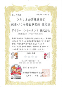ひろしま企業健康宣言 認定証